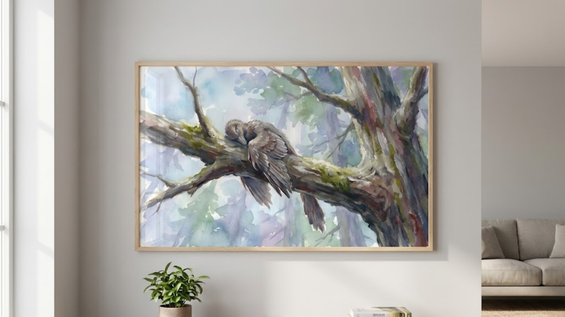 This piece imagines the creature not as a fossil, but as a living animal in deep sleep. It is a quiet study of texture: soft, early feathers rendered with the weight of heavy, impasto brushwork. The style balances between loose watercolor and thick oil painting, giving the print a rugged, tactile look.