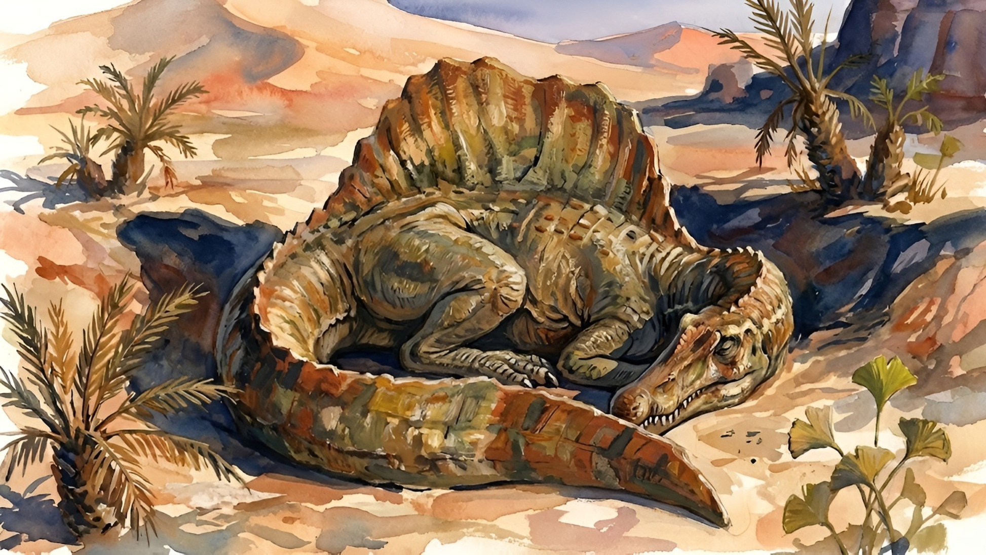 Unlike most other large theropods, Spinosaurus was highly adapted to a semi-aquatic lifestyle, spending much of its time in rivers and coastal environments hunting fish and other prey. This artwork captures a rare tranquil moment as the giant rests, offering a calm glimpse into the prehistoric world.